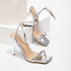 The Julia sandal, presented in a mirrored fabric on a platinum metallic background, is a tribute to sophisticated femininity. The thin straps intertwine harmoniously on the foot, creating a play of fluid lines and luminous reflections, while the 8cm stiletto heel elegantly adds height. The thin, shiny ankle strap adds...